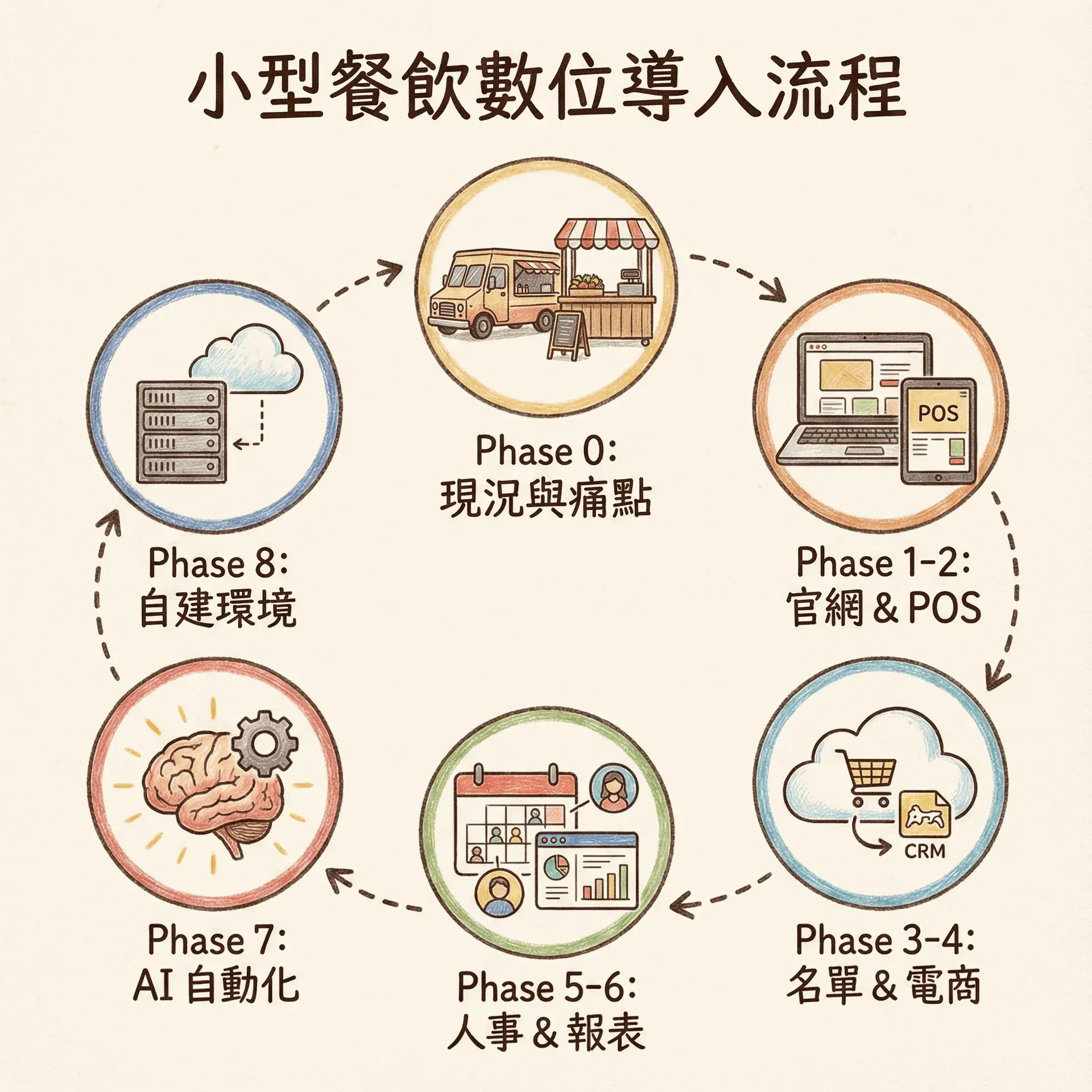 這套導入方式不是要把你變成大企業,而是專門為 餐車 + 小型餐飲店家設計的:
